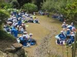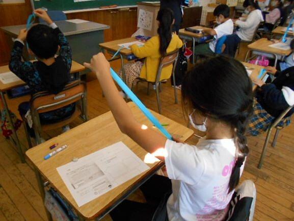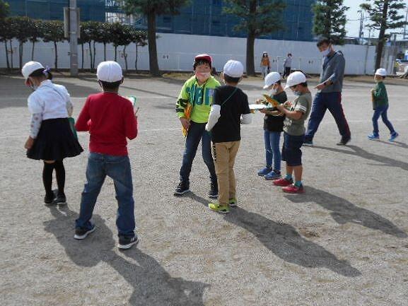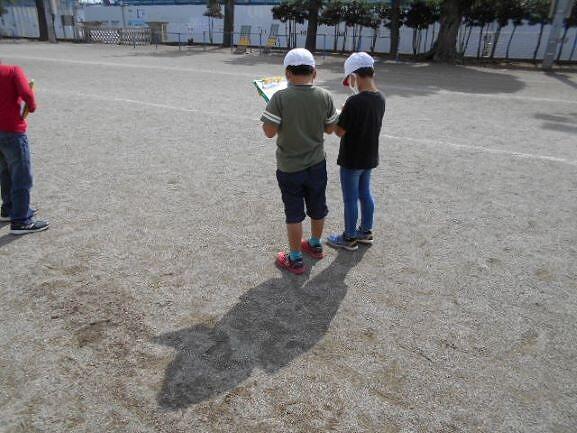 シャボン玉を作って飛ばしていました。うちわの骨組みを利用すると、一度にたくさんのシャボン玉を飛ばすことができます。虹色のシャボン玉がたくさん宙に舞う様子に、1年生も大はしゃぎでした。