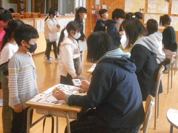 2年生の算数の時間に、たくさんのボランティアの皆さんが来てくださいました。2年生は、今、算数でかけ算九九を学習しています。今日は、ボランティアの皆さんにお力をお借りして、九九検定に挑戦します。