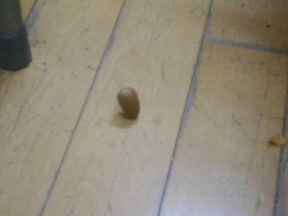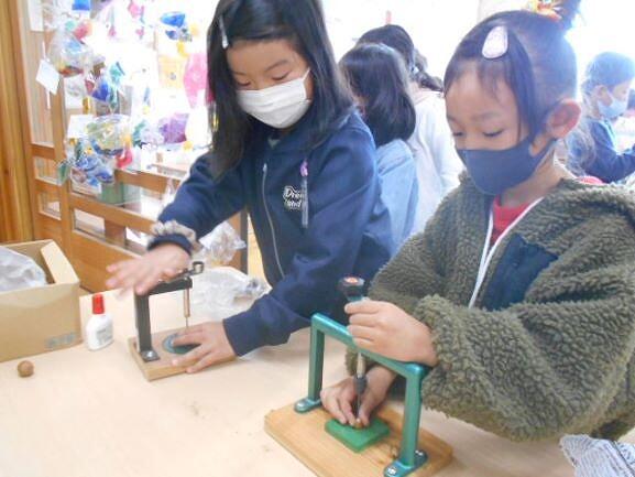 ドングリにドリルで穴をあけて・・・、あけた穴に楊枝をさして・・・、コマを作っているんですね。上手にできたかな?