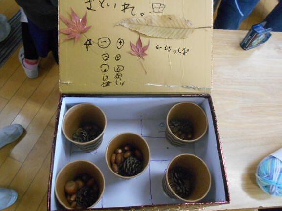 秋に見つけた木の実や松ぼっくりを使って、いろいろな遊び道具を作っていました。
