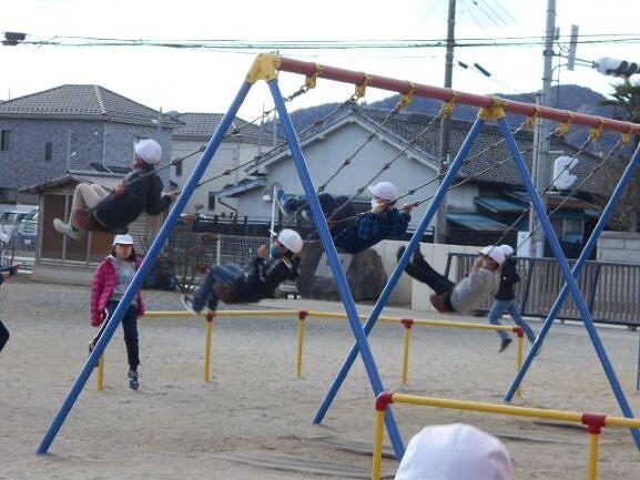 こちらは遊具で遊んでいます。冷たい風を切ってブランコを勢いよくこぐ子どもたち。本当にたくましいです。
