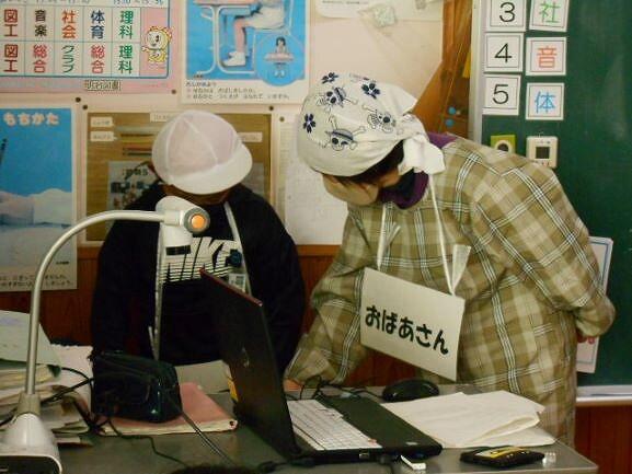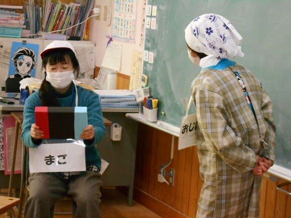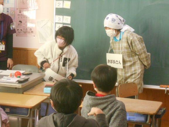 こちらはよくない例。孫役は先生です(迫真の演技)。ゲームに夢中で優しさが足りません。「どこがいけないのかな?」「自分だったらどうするかな?」と、子どもたちは考えます。そして、孫役を交代。