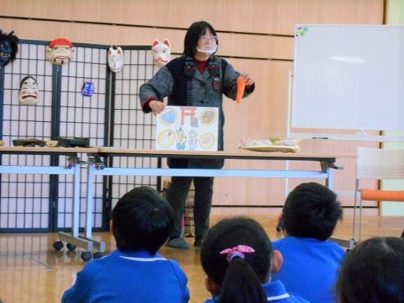 給食に先立ち、栃木市在住の語り部、間中一代さんにお越しいただき、第4学年を対象に、本日のメニューに関わりのあるお話をお聞きしました。