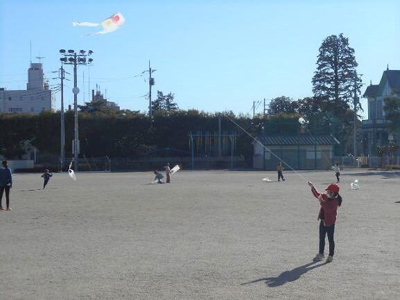 1年生です。生活科で凧を作りました。今日は絶好の凧揚げ日和。風をうまく利用して、上手に凧を揚げていました。