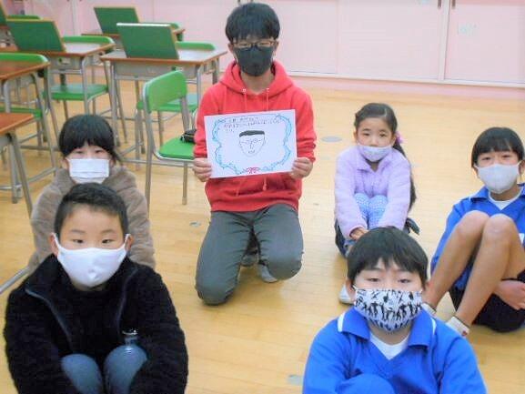 次の活動は「6年生の似顔絵リレー」です。1~5年生が「輪郭・目・鼻」といった具合に、パーツごとに6年生の似顔絵を描いていきます。