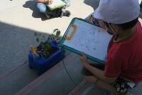 を育てています。ミニトマト・ピーマン・オクラ・キュウリなどいろいろな野菜が並んでいます。1年生のアサガオと同様に、学級のベランダで生長を観察