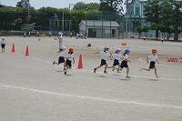 をしているみなさんが、走り抜けていきます。砂場では、日下部先生と幅跳び