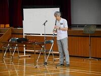 校庭に児童が整列したところで、全校生にボランティアのみなさんを紹介し、元気よくあいさつをしました。「よろしくお願いします。」