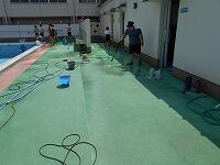 みんなで協力して、デッキブラシやたわしを使ってプールの汚れを落としました。短時間の作業でしたが、プールがみるみるきれい