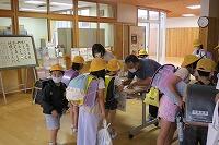 たくさんの児童が図書袋を手にやってきました。床に貼られたテープに沿って、並んで