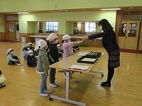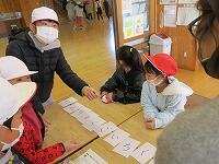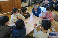 はじめの活動は、クリスマスに関する絵カードの「パズルゲーム」です。みんなサンタやトナカイになりきって、、、