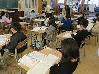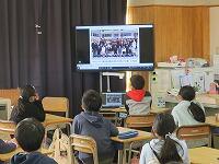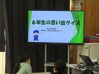 会の進行は、企画委員会キラキラ5年生児童星が担当しました。「開会のことば」「児童代表のことば」に続き、一つ目の活動は『6年生笑う思い出クイズ?』です。各教室では、大型テレビ情報処理・パソコンに映し出される6年生キラキラに関するクイズ?にみんなで答えています。みんなにこにこ笑う笑顔です。