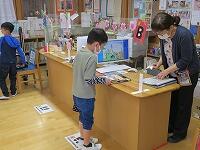 「どれにしようかな~。にっこり」本が選べた人は、カウンターに、本本のバーコードがよく見えるように出します。「借ります。」おもしろそうな本を見つけましたね。