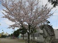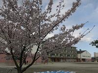 校庭のチューリップも、赤・白・黄色・ピンク、、、と色とりどりに咲いていて、東門近くの枝垂れ桜は濃い桃色の花をつけています。西側道路沿いの桜は満開笑う児童の登校を待ちわびています。