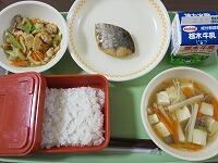今日の給食は、旬のたけのこキラキラを取り入れた、「ごはん・牛乳・たけのこごはん笑うの具・鰆の西京焼き・うすくず汁」の献立給食・食事でした。たけのこごはん笑うの具をごはんに混ぜていただきました。