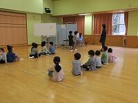 1年生も、音をたてないように静かに花丸並んで待っています。音お知らせが聞こえたら手を挙げてね。