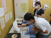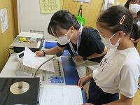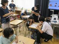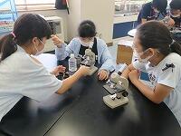 6年生は理科室理科・実験で何やら実験中理科・実験、のぞいてみると、、、「身近な池や川で見られる小さな生物キラキラについて虫眼鏡調べよう」を学習のめあて星に、みんなで顕微鏡キラキラをのぞいています。児童が持ち寄った「池汗・焦るや川汗・焦るの水」や、八城先生ががんばって急ぎ汲んできた「県庁堀汗・焦るの水」の中にいる「小さな生き物キラキラ」を確かめていました。