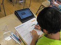 合同な三角形の書き方を考えてワークシートに鉛筆作図し、いろいろな書き方を虫眼鏡見つけました。