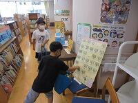 今年も、夏休み晴れの図書室開館笑うが、10回!予定されています。今日も、たくさんの児童が本本を借りに来てくれています。図書室入り口では、手指の消毒汗・焦ると名簿のチェック鉛筆をします。児童が手に持っているオレンジ色のカードは、昨年度も大好評の『図書館本ビンゴキラキラ』のカードです。今日の日付のマスに、村野先生がスタンプにっこりを押してくれます。