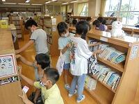 夏休み笑うまで2週間となり、今日は夏休み貸出キラキラ(一人3冊!借りることができます)前の、最終貸出日星です。たくさんの児童が図書室本に本を借りに来ています。2時間目には2年生が、図書室の決まりを守って了解、間隔を空けて並んでピース本を借りていました。決められた場所で借りた本を図書袋に入れて、カードもポケットにきちんと返して花丸いました。
