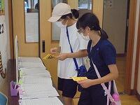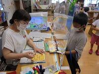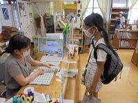 今年も、夏休み晴れの図書室開館笑うが、10回!予定されています。今日も、たくさんの児童が本本を借りに来てくれています。図書室入り口では、手指の消毒汗・焦ると名簿のチェック鉛筆をします。児童が手に持っているオレンジ色のカードは、昨年度も大好評の『図書館本ビンゴキラキラ』のカードです。今日の日付のマスに、村野先生がスタンプにっこりを押してくれます。