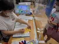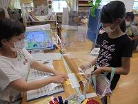 今日は、7月最終の図書室本開館日キラキラ。親子で来室した人やなかよし学童のみなさんが本を借りに来ていました。間隔を空けて了解、きちんと並んで花丸いますね。本を借りる人はビンゴカード鉛筆も一緒に村野先生に出します。今日の日付のところにスタンプ星を押してもらって、、、おっ。ビンゴ!になりましたね。