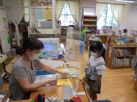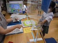 今日は、夏休み後半の『図書室開館日キラキラ』で、たくさんの児童が本を借りに来ていました。毎回日替わりで登場する「妖怪?クイズ」も、はや7問目!。じっくり虫眼鏡問題を読んでいるみなさんがいました。ビンゴカード星の今日の日付の欄に、答えの番号を鉛筆書きましょう。