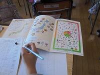 教科書の栄養分類表星や教室に掲示してある献立表笑うも参考に、みなさん熱心に花丸献立作り鉛筆に取り組みました。
