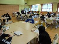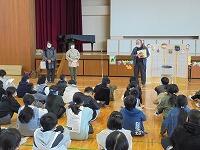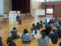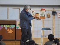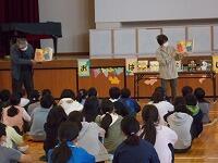 「だれも知らない」、「カエサル君とカレンダー」、「ぼくがラーメン食べているとき」など、学年によってプログラム星変えて、絵本の読み聞かせ笑うや情景が目に浮かぶような民話語りお知らせを聞かせてくださいました。