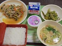 今日の給食給食・食事は『とち介笑うランチキラキラ』で、「ごはん・牛乳・豚肉星とにら星のキムチ炒め・黒大豆枝豆星・中華風卵スープ・とち介ぶどう星ゼリー」の献立でした。