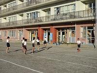 朝晴れ、登校した後にランドセルを教室に置いてから、校庭に出てきて、走っている急ぎ児童笑うもいます。内側のトラックは1・2年生!、外側の大回りは3~6年生!が走って急ぎいます。一緒に走っている先生にっこりもいます。「みなさん、ナイスファイト~お知らせ。」