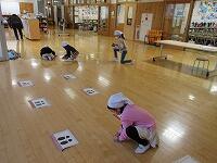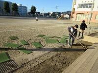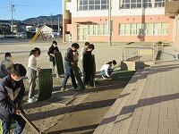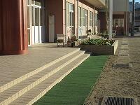 昇降口では、環境美化委員会星のみなさんが、毎週火曜日朝ピースの活動『グリーンマット!の砂取り急ぎ』をしてくれていました。1枚ずつはがして了解砂を落としたら、下をきれいにキラキラならします。