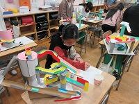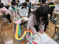 トンネル!や分岐了解、らせん状のすべり台笑うなど、コースを工夫した力作が勢ぞろい。工夫ひらめきしたポイントを解説会議・研修してくれました。では、さっそくビー玉星を転がしてみましょう、、、コロコロピース、コロコロ笑う、、、