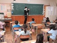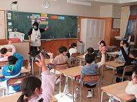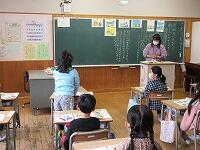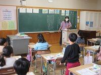 ランドセルの片付けが終わった1年生星は、縄跳び急ぎを手に清田先生と練習中了解。「せんせ~い、見てみて~。」「1ぷん!とべるんだよ~笑う。」「すごいですね~花丸。」