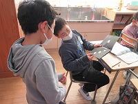 4年生星の教室から元気な笑う声が聞こえてきます。今日の外国語活動ピース、学習のGOALキラキラは、「2学期に学んだ言葉をふり返ろう虫眼鏡。」で、みんなでグループ「What`s this?」を使って『ブラック!ホールまるクイズ?!』を出し合っていました。ヒントの穴まる(ホール)は、最初はひとつ了解ですが、難しい時は3つピース→5つにっこりとヒントの穴まるがふえていき、隠れている図鉛筆が見えるようになります。