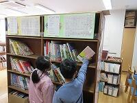 1・2年生星の必読図書キラキラはこの棚です。クラスのカードボード了解から、自分の図書カードノート・レポートを手に取って「おねがいしますお知らせ。」