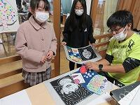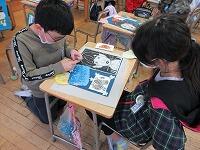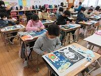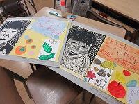 4年生星の各教室では、先週刷った『木版画急ぎ』・絵手紙ボランティアのみなさんと描いた『絵手紙美術・図工』・折り紙をちぎって作った『ちぎり絵ピース』を組み合わせて、すてきなデザイン作品キラキラを完成させていました。「おばあちゃんへ かぜをひかないようにねにっこり」「やさしい家族へ いつもありがとうハート」すてきなメッセージお知らせ入りです。