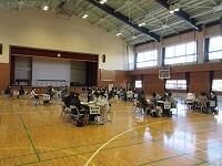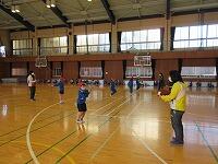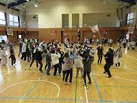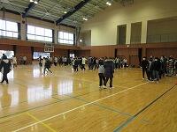 【体育館での様子:6つの班合同で、ドッジボールをしました。】