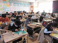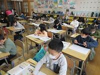 6年生の書写鉛筆では、毛筆の最後の課題会議・研修は、卒業生らしい『旅立ちの朝キラキラ』です。みなさん真剣な表情了解で、半紙に向かい合っていました。難しい5文字!のことばなので、バランス星を考えて、お手本を参考に書いていきます。