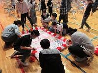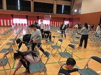 体育館フロアではいすをきちんと了解並べなおし急ぎ、、、