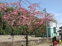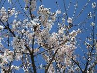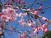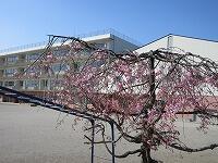 児童笑うのみなさん、春休みキラキラを元気に過ごしていますか?!校庭東側のしだれ桜キラキラが、きれいなピンク色ピースの花をつけていました。校庭の他の桜より、濃いめ!のピンク色キラキラのしだれ桜、青空晴れをバックに咲き誇っています。