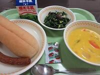 今日の給食は「コッペパン(セルフホットドック)・牛乳・ウインナー・ほうれん草ときのこのソテー・かぼちゃ