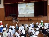 実は、この3名は、授業とは別に自分たちが関心をもった災害と防災について調べたことをみんなに知ってほしいとイベントを計画したそうです。内容も原稿も全部子どもたちだけで考えたんですと、5年生の先生方もうれしそうに教えてくださいました。