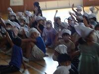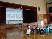 昼休みには、たくさんの1・2年生が体育館に集まり、5年生の子どもたち3名によるクイズが始まりました。