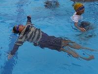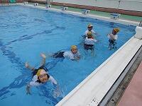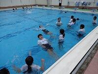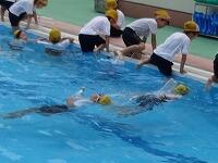 4年生は、水着の上に体育着を着て行いました。動きにくさを確認して、仰向きになる浮き方などを練習しました。体育着に空気が入るようにする工夫を考える子どももいました。