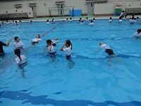 6年生は、水着の上に普段着を着て行いました。いつもの水慣れや流れるプールの動きを通して、動きにくさを体験しました。仰向けになる浮き方を練習したり、ペットボトルやポリ袋を使う方法を体験したりすることができました。