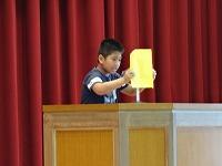 1年生、3年生の代表の子どもたちが、1学期を振り返って学習や生活でがんばったことを発表しました。夏休みや2学期にがんばりたいことも伝えることができました。発表の後、みんなから大きな拍手が贈られました。