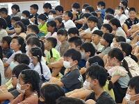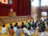 校長先生からは、始業式の話をもとに、めあてに向かってチャレンジすることやがんばっている人を応援することができたか振り返ってみようというお話がありました。パリで開催されるオリンピック・パラリンピックの選手を例に、あきらめたくなったときがあっても、がんばり抜くことでみんなから応援される。選手も子どもたちも同じだから、夏休みを生かして、がんばり抜いてほしいとのお話もありました。