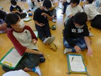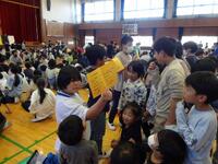 図書委員会の子どもたちによる読書集会が行われました。お昼休みに1~6年生の全ての子どもたちが体育館に集まりました。いつものなかよし班で集合し、集会が始まるのを楽しみに待ちました。