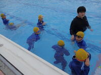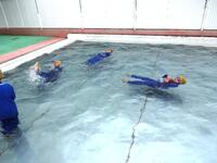 冬用体育着を着てプールに入った子どもたちは、いつもと違って体が動かしにくいことに気付きました。ペットボトルを使って体を浮かそうとしても体に力が入るとうまくいきません。